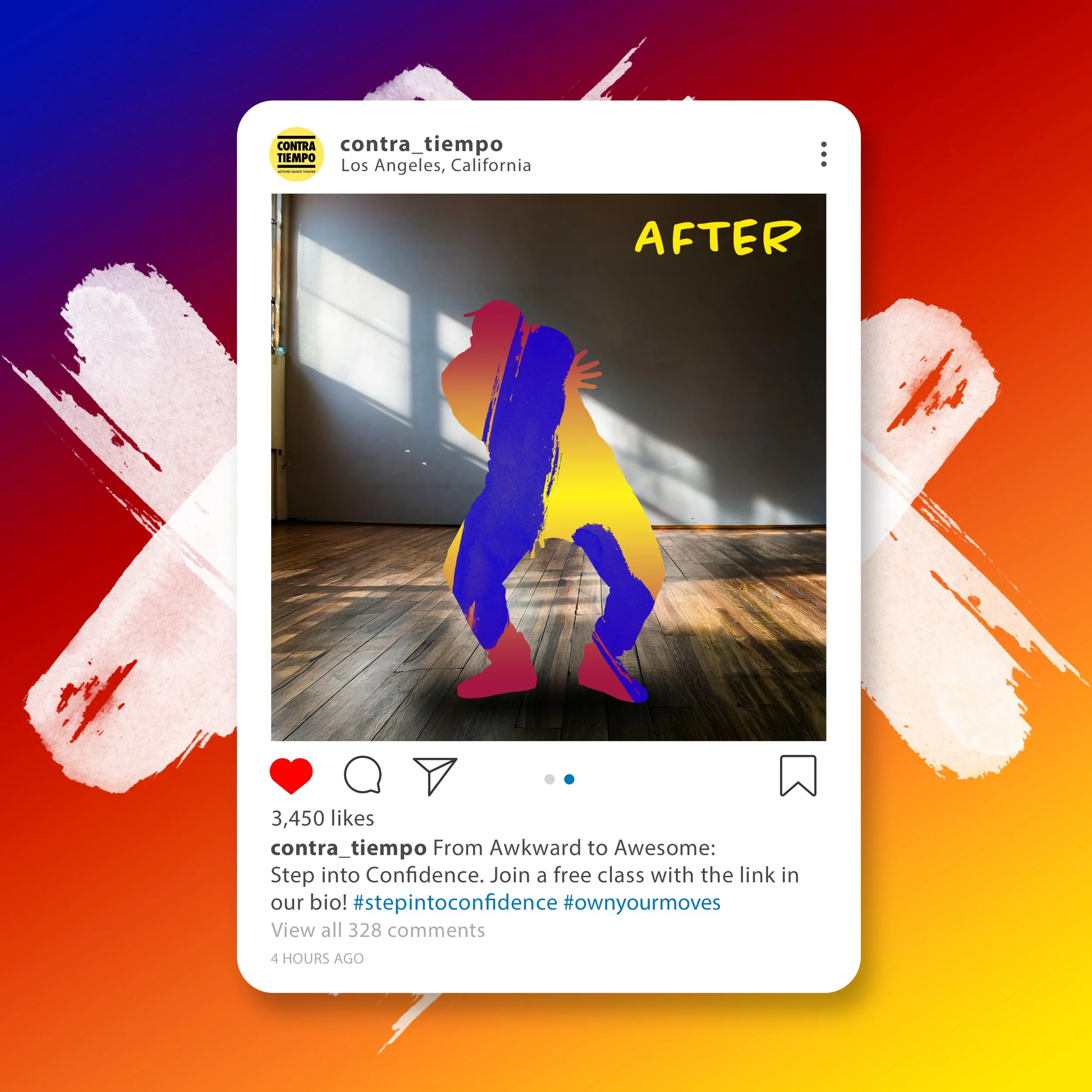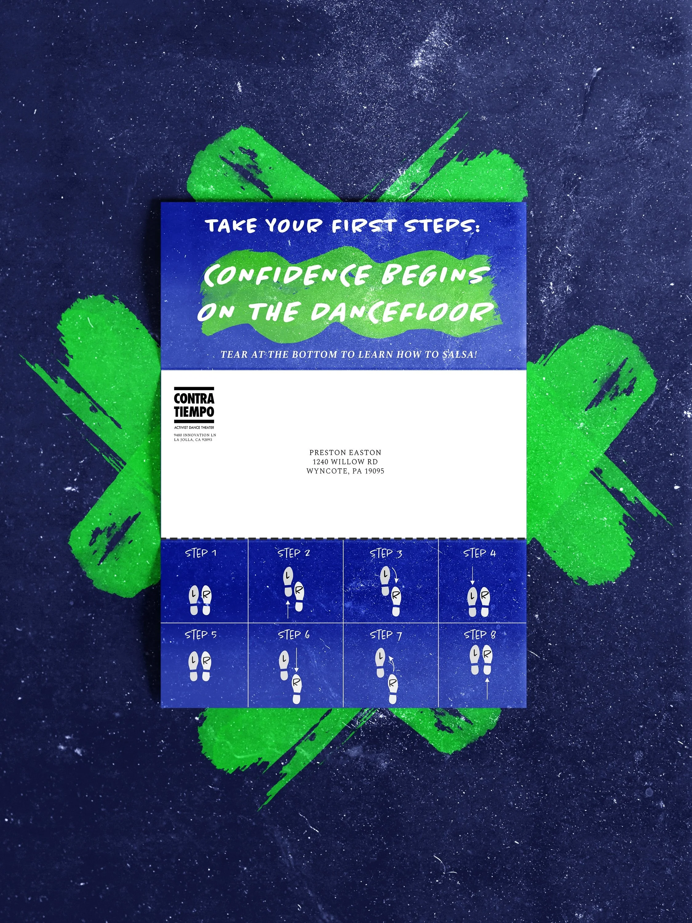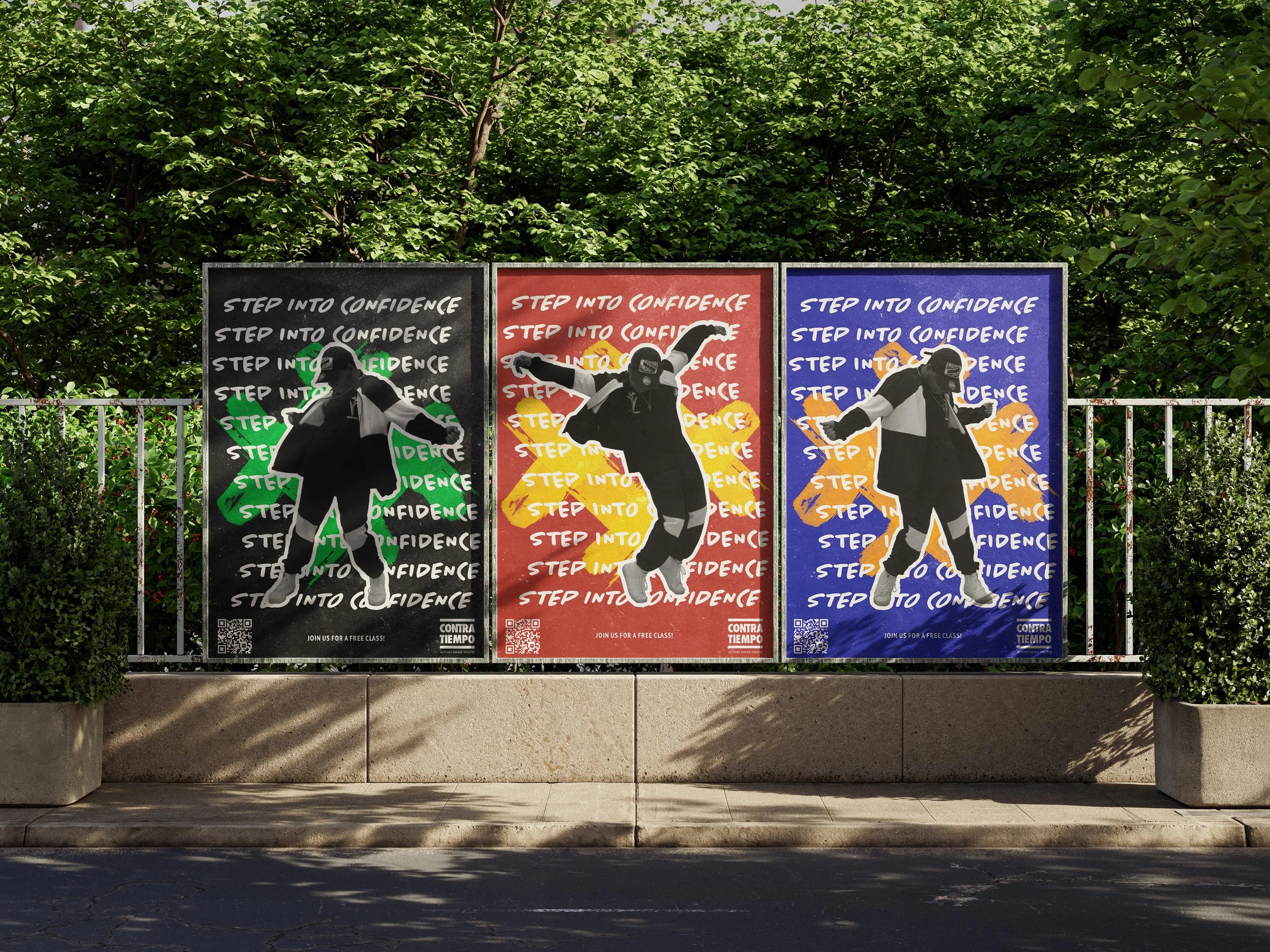 Contra Tiempo’s “Step into Confidence” ad campaign bursts with vibrant colors and rich textures, aiming to inspire men of all ages to embrace the joy of dance. The campaign showcases a dynamic model captured in a series of striking dance poses, featured prominently across a sleek magazine spread, an eye-catching series of posters, and a beautiful wall ad that demands attention. The lively paint textures and bold hues extend their energetic reach into direct mail pieces and engaging social media content, inviting everyone to step into a world of rhythm and self-expression.