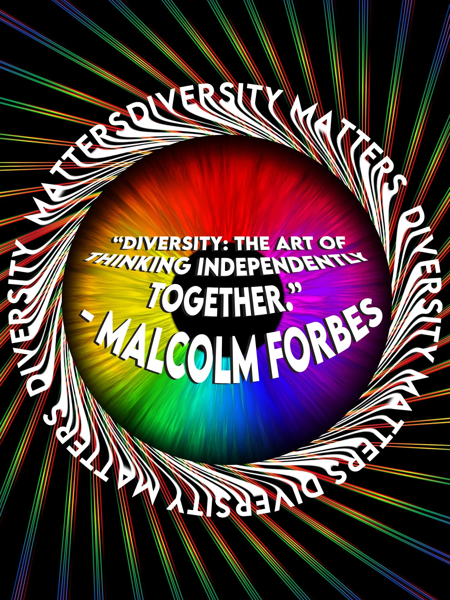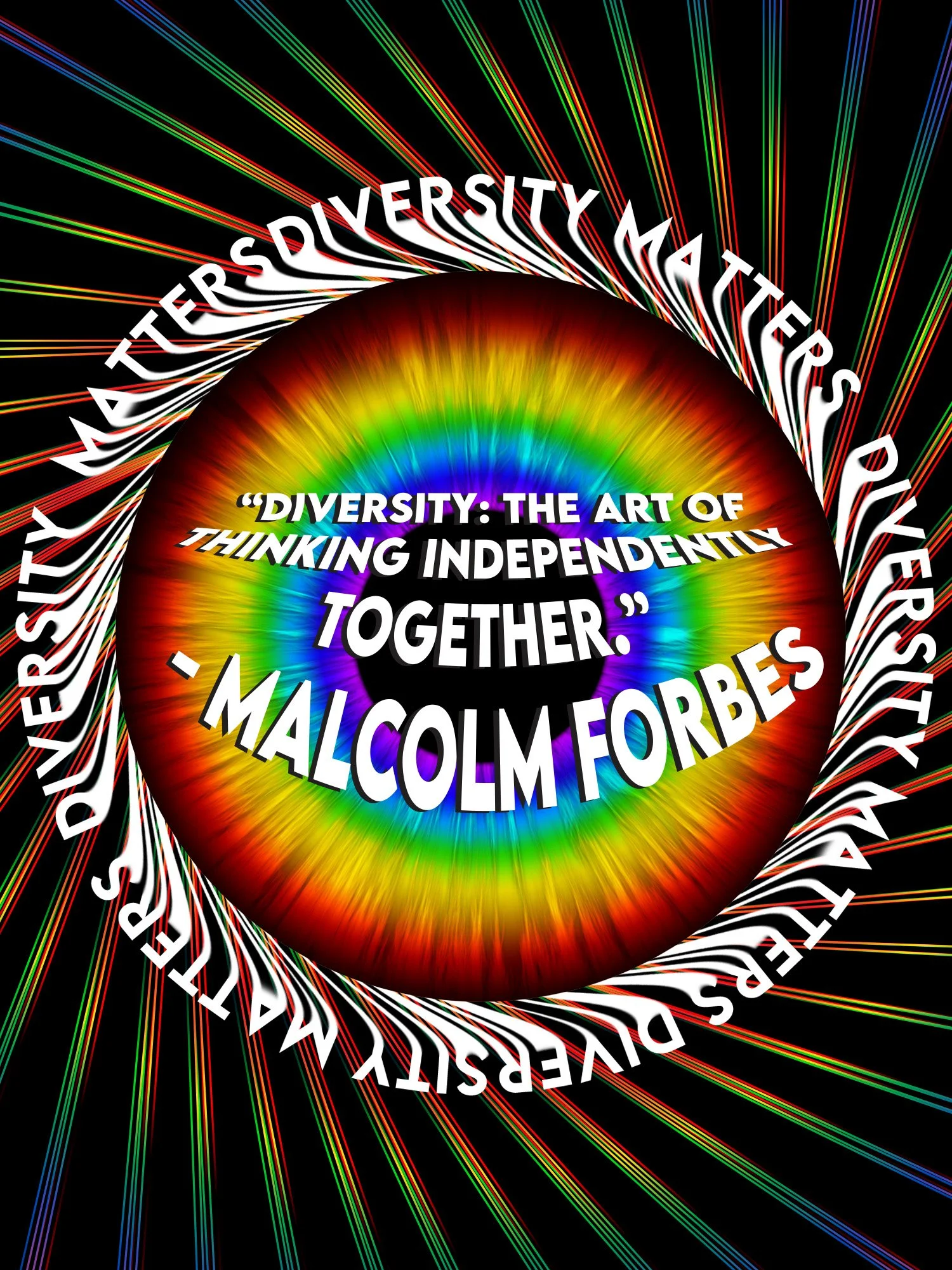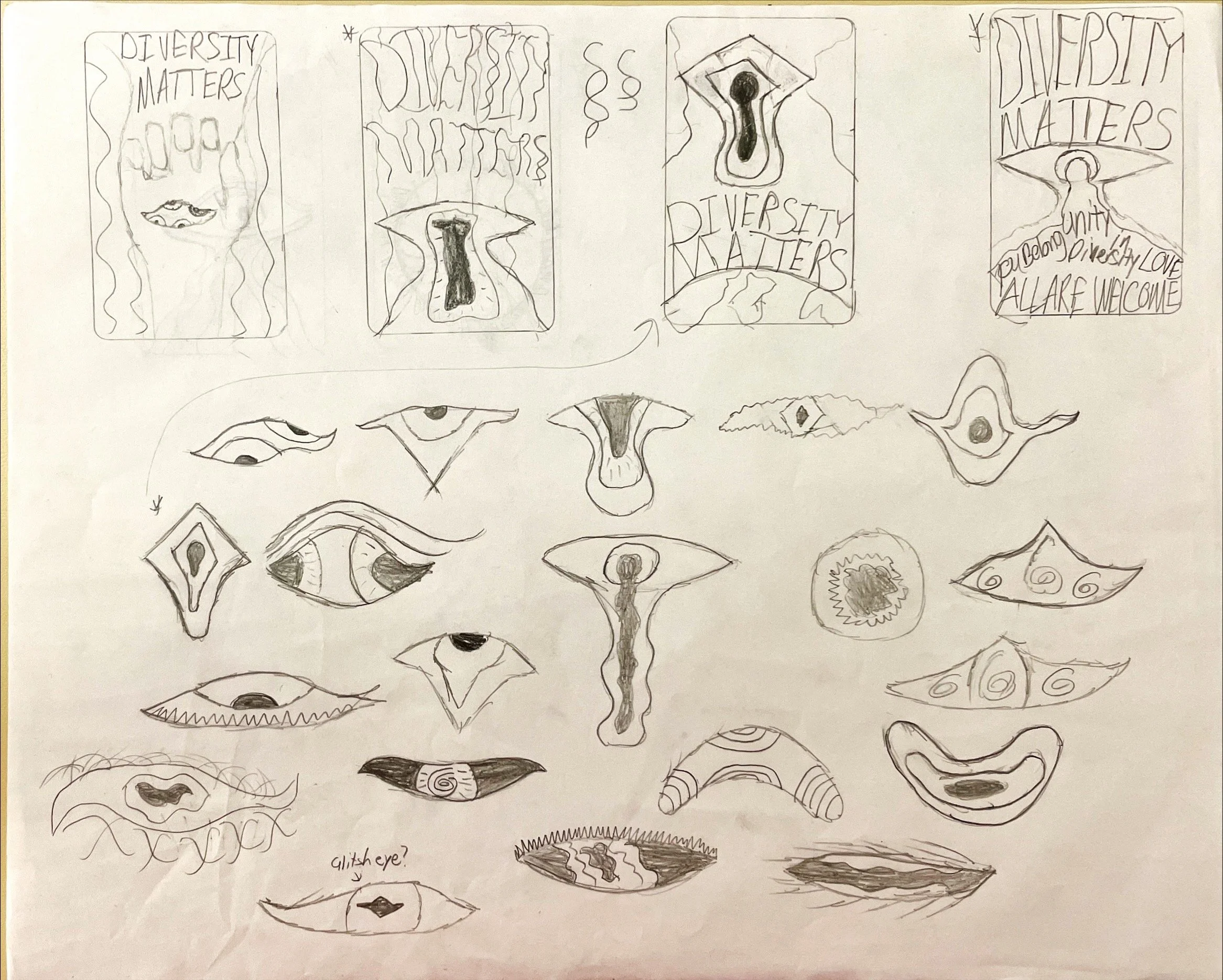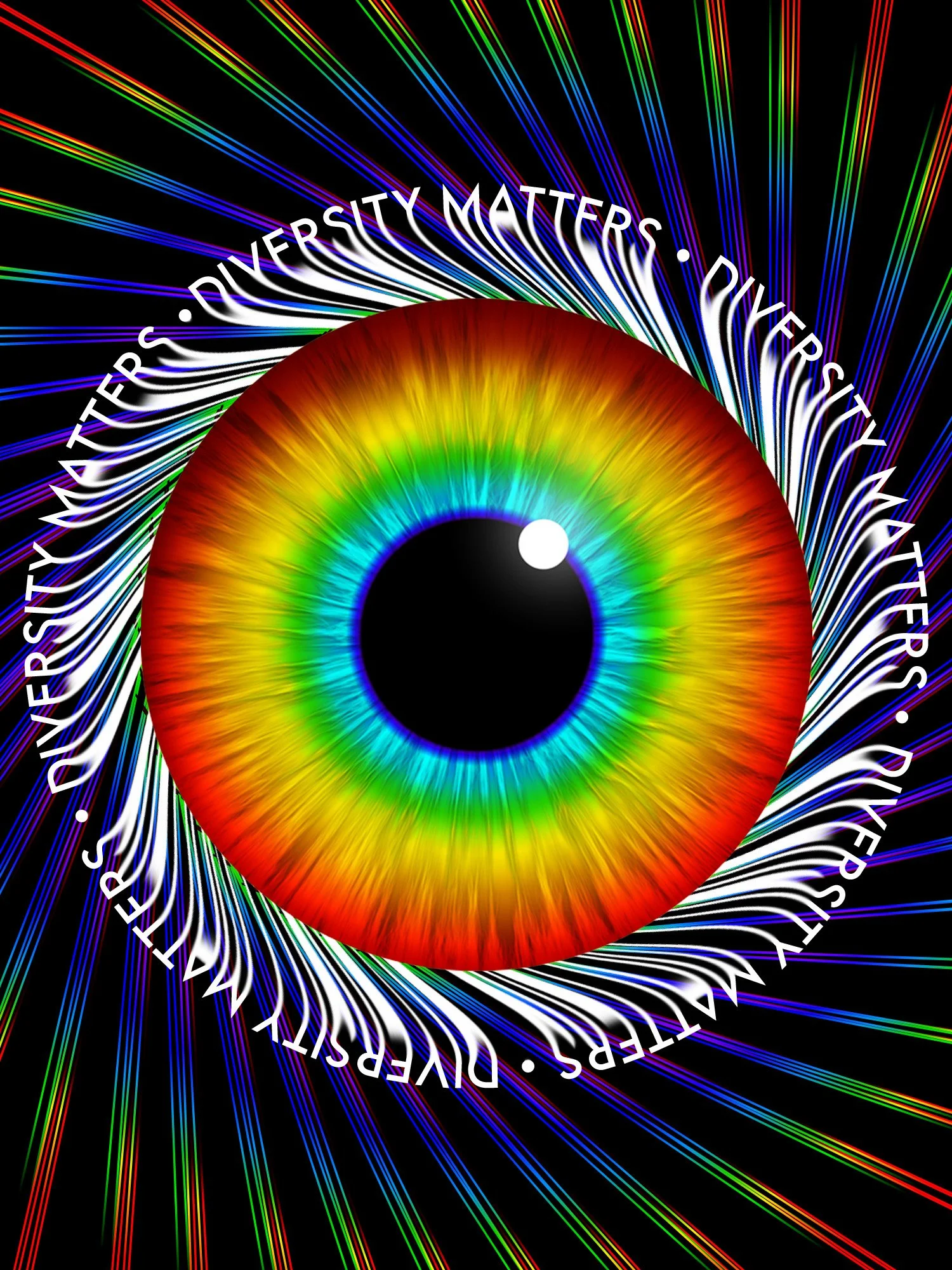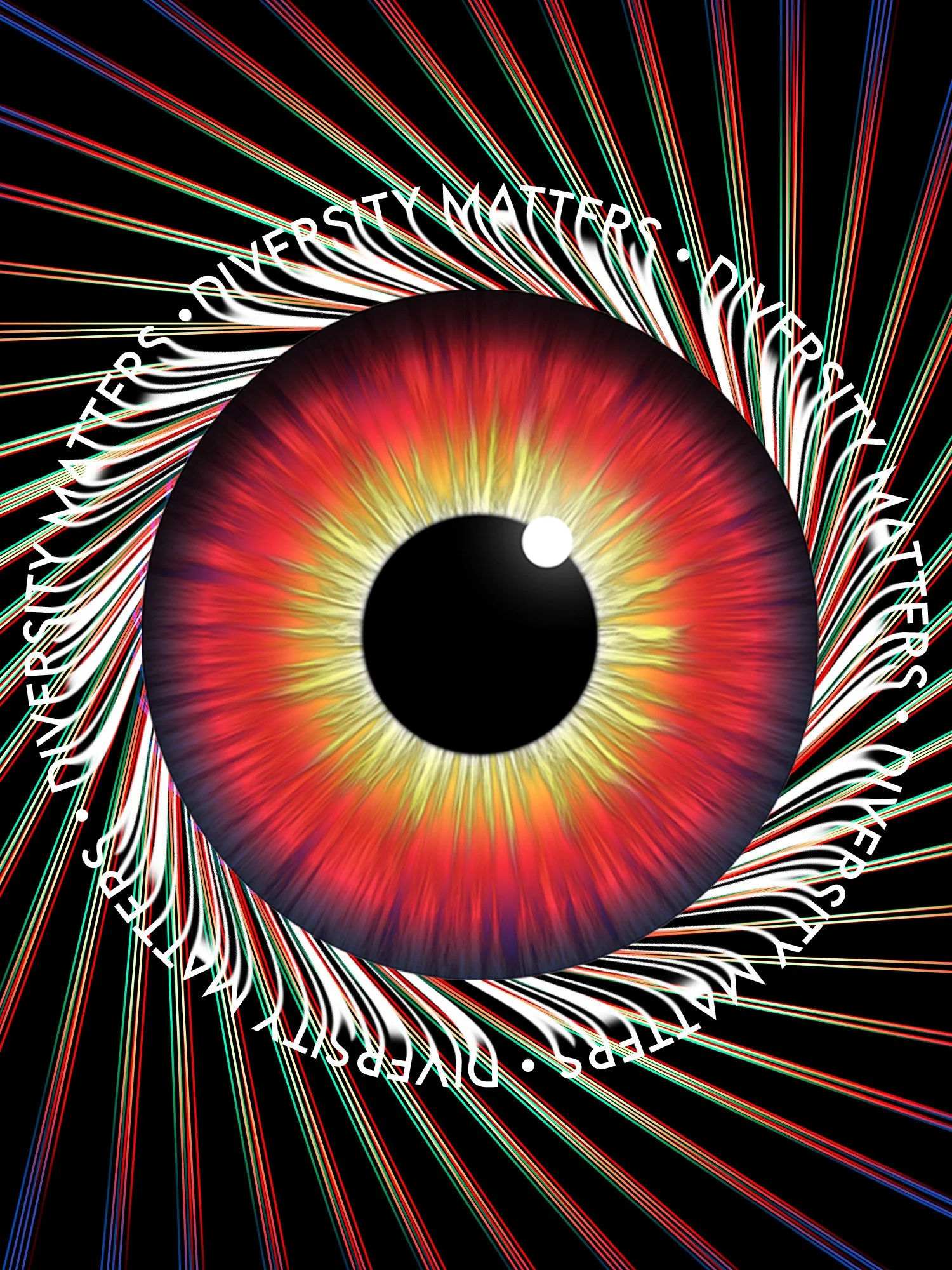 This poster is my visual response to the question, “What does diversity mean to me?” Centered on an eye to represent perspective, it uses swirling rainbow lines and warped type to symbolize how unique identities come together to shape how we see the world. Diversity expands vision, sparks connection, and drives creative growth.